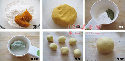 15、在手掌中滚圆蜜豆团,放在案板上用细线或刀背压出南瓜表面的纹路。