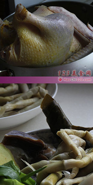 3、将老粽叶铺在砂锅底部,上面放入老鸭、笋干、咸肉,加入葱、姜、黄酒、高汤,用文火炖4-5小时再加入盐、鸡精即可食用。