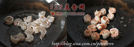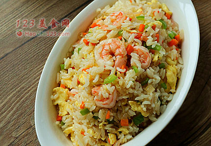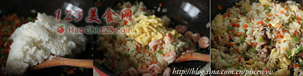 14、将米饭放入,翻炒均匀后,放入鸡蛋及虾仁。