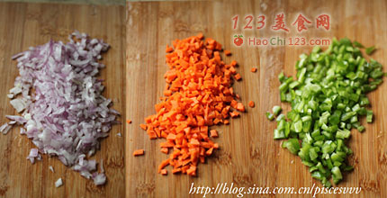 4、洋葱、胡萝卜及青椒洗净后切成丁。