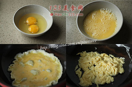 7、热锅,入适量色拉油,倒入调好的鸡蛋液。