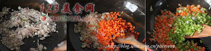 11、锅里倒入适量油,将洋葱丁倒入,煸炒出香味。