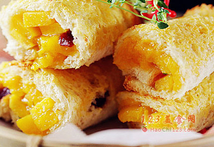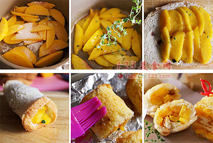 4、蔓越莓吐司片平铺,将桃子平均铺在吐司片上。