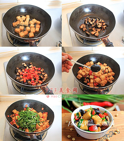 8、放提前煎好的豆腐块,调入1勺盐和1大勺蚝油,翻炒均匀至豆腐丁均匀的裹上耗油汁。
