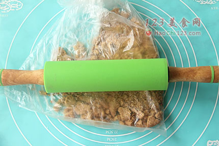 2、黄油放在室温下软化,隔热水融化成液体,稍微冷却后与饼干混合搅拌在一起。