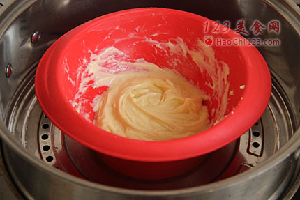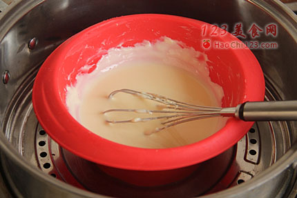 6、离开热水,待稍降温后再分别加入蛋黄、蛋白及香草精,继续用打蛋器搅拌呈均匀的奶酪糊。