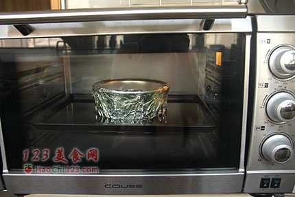9、烤箱预热后,烤盘上倒入热水,将蛋糕模具外面包上锡纸放入烤盘中,烤盘放在烤箱中层,以上下火160度,烘烤50分钟左右。