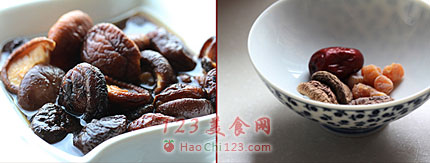 3、瑶柱和香菇分别入清水泡发。