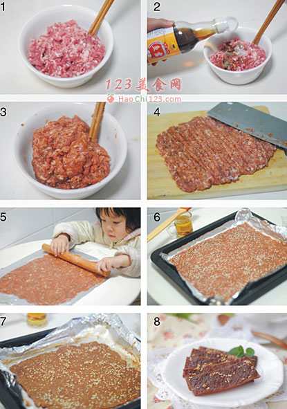 8、晾凉后肉脯就变干了,切块即可。