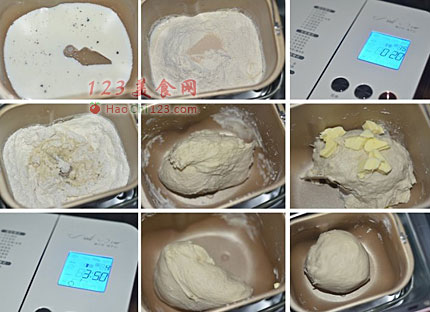 3、揉面结束,加入软化的黄油,选择和风面包程序,750克、烧色“中”,启动。
