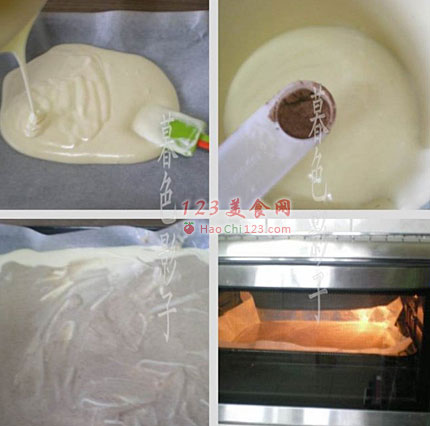9、烤盘铺油纸先倒进白色蛋糊。
