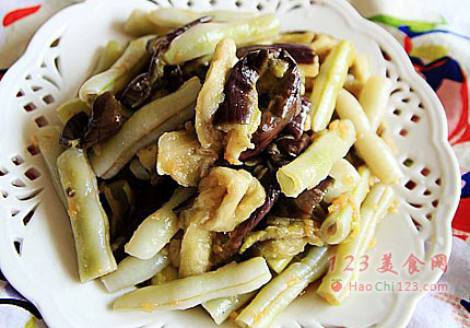 5、芸豆切段,茄子撕成段。
