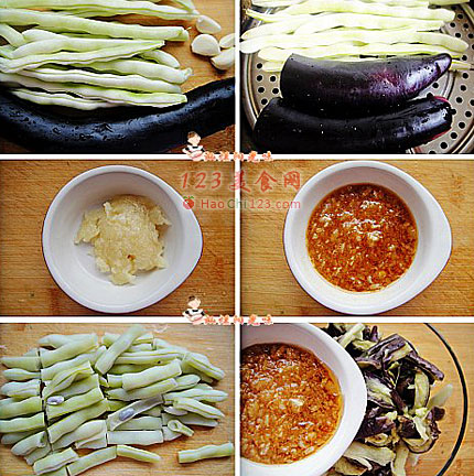 2、芸豆、茄子洗净入蒸锅蒸十分钟,取出放凉。