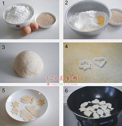 4、5、擀成薄面皮,用饼干模刻出花型,或者直接用刀切。