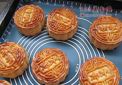 3、烤箱200度预热,入烤箱前月饼表面喷水,倒数第二层烤5分钟定型后取出,表面小心刷上蛋黄液(只刷表面,不用刷旁边),倒数第三层再烤15分钟后即可(看看表面上色太深可加盖锡纸。本来是20分钟就行了,但LG说会不会不熟的,所以后面的一盘我硬是加了10分钟,结果真是杯具了,朋友说今年的月饼馅料不够油,太散了,我回想一下,那里是不够油,是时间太过,烤干了,所以说,在这方面,偶才是专业的,外行人的话不能听啊)。