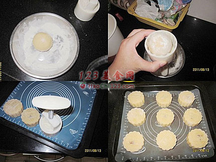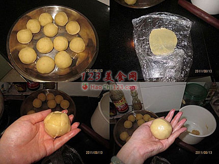 2、将馅料分成55克一份,包入咸蛋黄一个,皮分成20克一份,用推的手法慢慢包好,比较难包,但小心一点来,一定能包的上的,包好后适量滚上一圈干粉,模具洒上适量干粉,敲去多余的,小心将月饼印好即可(具体的包的手法看下面的详细图就可以了),我用的是75克的模具,一盘正好能放15个。