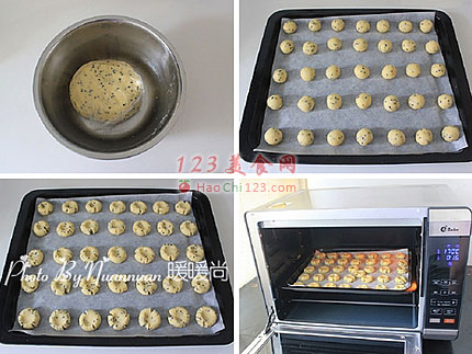 6、将冷藏好的面团取出,分割成10克/个的小剂子,搓成球状,整齐码放在烤盘入。