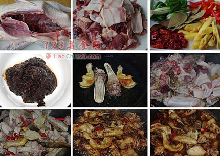 4、锅子热油,先下鸭头、鸭掌和鸭舌,炸至焦黄后,再下其他鸭块一起爆炒。