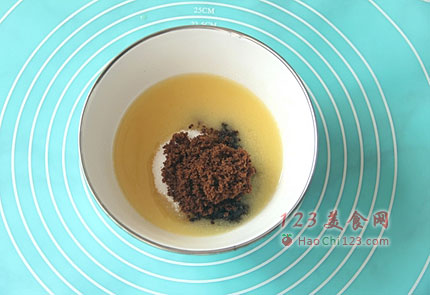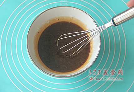4、将第2步的液体混合物与第3步的粉类混合物混合在一起,并用橡皮刮刀小心地搅拌均匀,成为湿润的面糊。