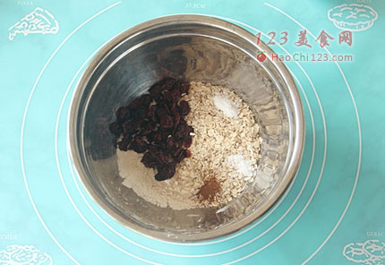 3、将低筋面粉、燕麦片、蔓越莓干、泡打粉、小苏打粉、肉桂粉放入另一料理盆中混合均匀。
