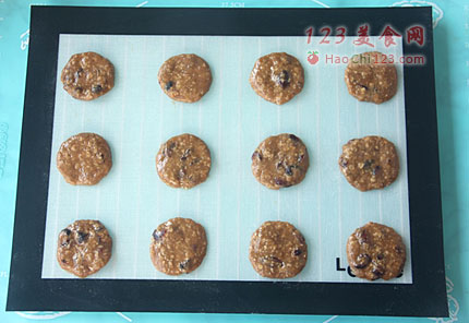 6、把面糊压扁,并排入垫在烤架上的烘焙垫上。