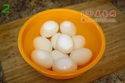 2、鸡蛋洗净后,放入冷水里开中火煮8分钟左右,捞出浸泡在冷水里,剥去蛋壳备用。