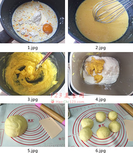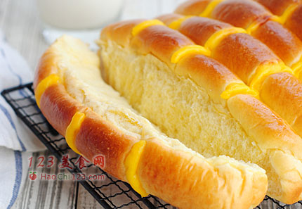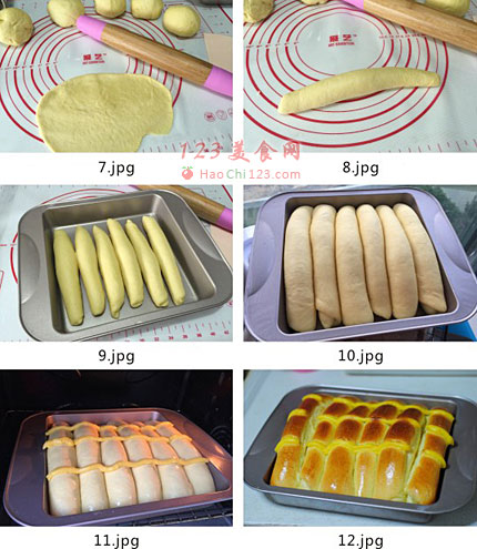 11、刷鸡蛋液,多余35克卡仕达酱装裱花袋中,在面包胚表面挤三条。