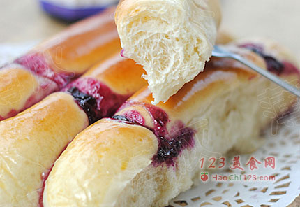 7、刷蛋液,挤上蓝莓果酱。