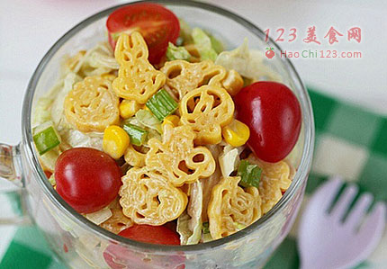 5、煮好的意面和小番茄、生菜丝、玉米粒放入大碗里摆好,淋入拌好的调味汁拌匀就可以享用了。[sushi.laoyanhuo.com]
