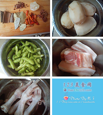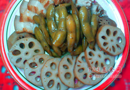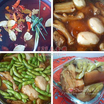 4、大火煮开卤水后,小火煮上半小时后放入毛豆(因为毛豆易熟些,所以晚放半小时),再接着卤煮半小时,熄火盖上锅盖让所有食材在卤水中浸泡到卤汁完全变凉后,就可以出锅切片摆盘吃啦(一般看下,食材全部熟了就不用煮了)。