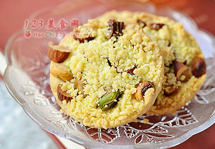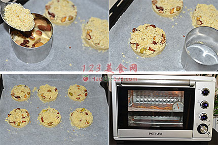 7、压好的面饼上面放适量坚果,再撒上少许面团材料。