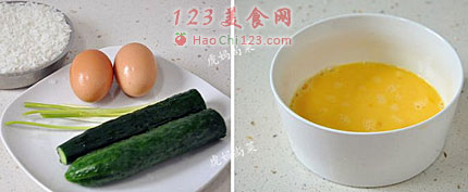 2、蒸饭的时间将鸡蛋磕入碗中打散,黄瓜洗净切片。
