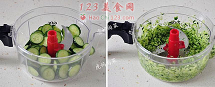 4、盖上盖子,把黄瓜搅打成细碎状。