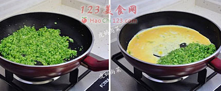 5、锅中油热后放入葱花炝锅,然后倒入黄瓜碎,翻炒至黄瓜颜色变得更绿。