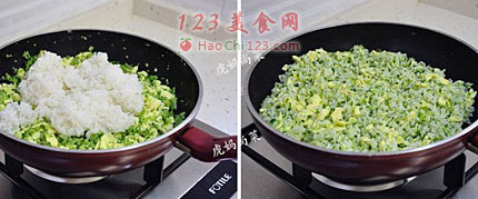 7、倒入米饭,翻炒均匀至米饭粒粒分散。