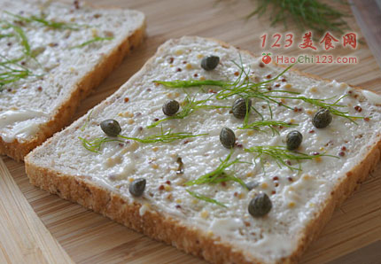 3、把蛋黄酱涂抹在面包片上,点缀小茴香叶子和刺山柑。