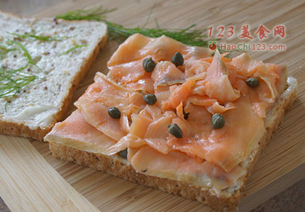 4、铺上烟熏三文鱼片,再放上一些刺山柑,盖上另一片面包做成三文治。