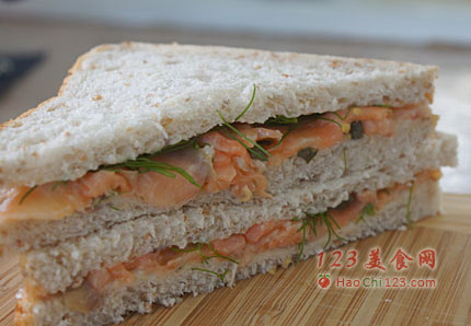 3、这个午餐三文治,也是偶的大爱之一,用烟熏三文鱼片做成三文治,轻量又健康的小午餐。[sushi.laoyanhuo.com]