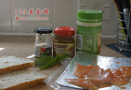 1、芥末子,刺山柑和小茴香给三文鱼增添新鲜的味道,如果没有,也可以配上酸黄瓜片,也一样有风味的。