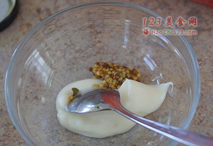 2、在一个小碗里,混合蛋黄酱和芥末子。