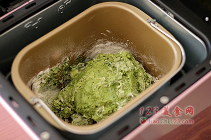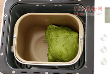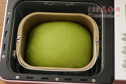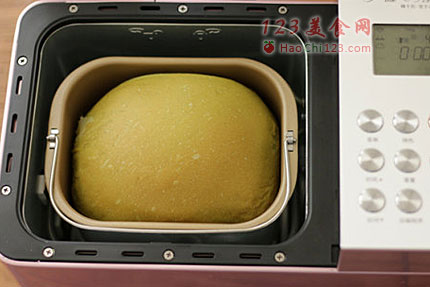 4、盖上面包机盖子等候面团发酵。接下来步骤4-6都是静静等待即可,加入黄油之后,面包机会帮我们自动完成接下来的工作。如图为搅拌4结束时的面团,拉开面团可见有薄膜,检查出膜这一步可省略。