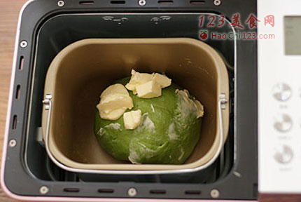 3、在“醒面2”时加入切小块黄油。面团在结束醒面2后会继续搅拌面团。