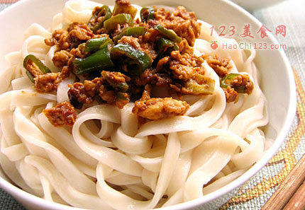 6、炒出酱香后,加入尖椒碎(我用的细长型的辣椒)。