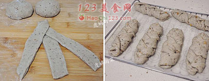 3、将发酵好的面团取出,揉去气泡,再分割成同等的50克/个的小面剂子。取其中一个擀薄,竖着割开均分成三条,顶部不要割断,然后依次叠压编成辫子状。