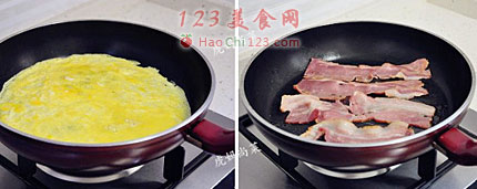 二、培根蛋堡做法:1、锅中刷一层薄油,倒入打散的鸡蛋液,小火煎至蛋液凝固即可。