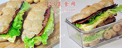 3、将辫子面包对半刨开,然后依次放上奶酪片、煎蛋、培根、生菜,然后再盖上另一片面包即可。
