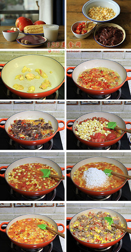 6、加入番茄片和玉米粒,撒入适量黑胡椒末。
