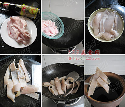 1、猪皮中的肥肉要尽量切的干净些,这样做出来的猪皮才不油腻。