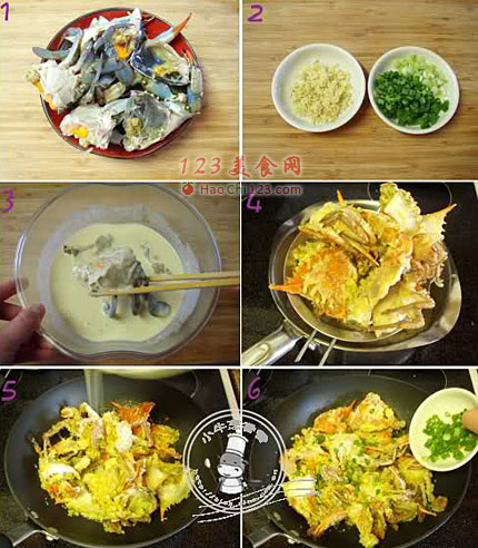 5、锅里加入适量橄榄油,放入蒜末、姜末、葱白爆香,倒入炸好沥干油的螃蟹块翻炒均匀,然后倒入剩余的蛋面糊快速翻炒,使所有的蛋面糊均匀的裹在螃蟹块上。