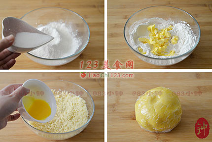 2、加入切成小块且室温稍软化后的黄油,用两只手一起搓成如面包屑般、均匀的颗粒。